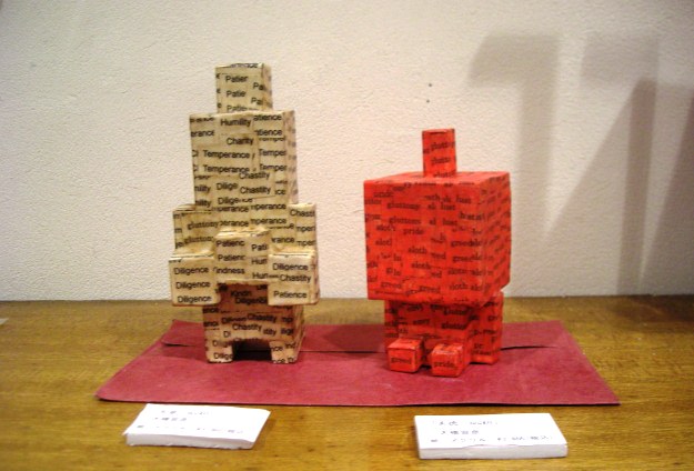 | 大罪 人間を罪に導く可能性があると見做されてきた欲望や感情。「暴食」、「色欲」、「強欲」、「憤怒」、「怠惰」、「傲慢」、「嫉妬」を英語にしたものが作品に張り付けてある。「鋼の錬金術師」という漫画を読んだことがある人にはピンとくると思われます。鬼の形をしています。 |