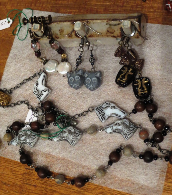 右: 新入荷 <sica>さんの、犬。猫のアクセサリー。猫のビーズ、レッド・オレンジなどのネックレスも人気です。