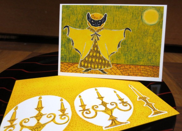 本六オリジナルのグッズ「夜の読書会」で人気、伊藤真紀さんの新作カード「月と蝙蝠」。ハロウィン近し。