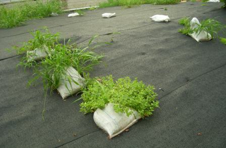 雑草除けのシートの上におかれた土嚢の、