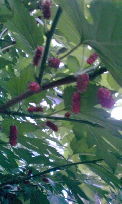 もう夕方。ふと見上げると、玄関の横の桑の実。
