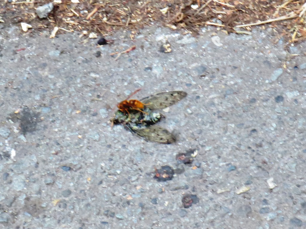 散歩道にそって、墓地が広がっている。ワンダ~。 蝉を運ぼうと、苦戦していた蜂。