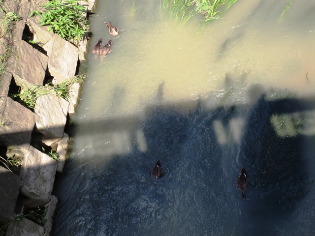 水がひいて、水が温み、鴨たちも日向ぼっこ。私の影もいっしょに。